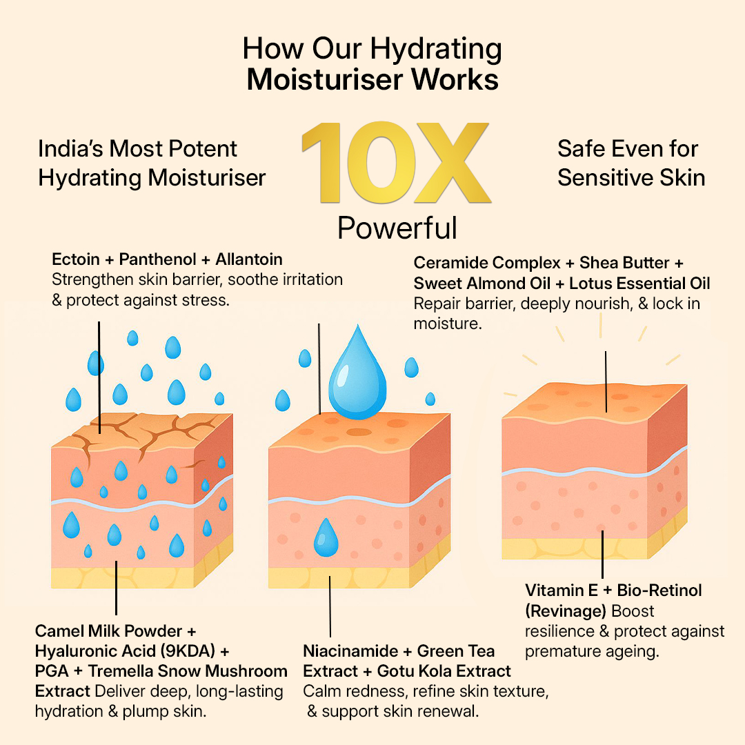 The Hydrating Serum & Moisturising Cream Combo is a deep-moisture skincare duo powered by camel milk, snow mushroom extract, hyaluronic acid (9 kDa), polyglutamic acid, ectoine, and ceramide complex. The serum offers lightweight hydration that penetrates quickly, while the moisturising cream provides long-lasting nourishment and barrier repair.