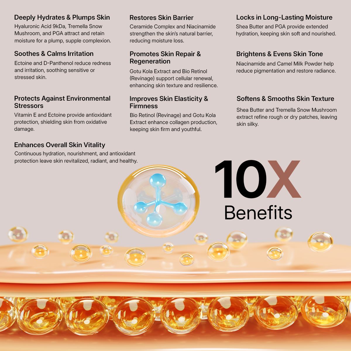 Strengthens Barrier – Camel milk and ceramides repair and protect against moisture loss.