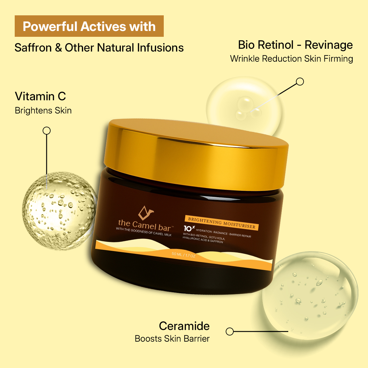 he Skin Brightening Serum & Moisturiser Combo is a powerful daily duo enriched with camel milk, niacinamide, alpha arbutin, saffron, vitamin C, pearl powder, and hyaluronic acid. The serum delivers fast-absorbing actives for targeted brightening, while the moisturiser provides lasting hydration and barrier support. Together, they create a complete skincare routine for luminous, healthy-looking skin.